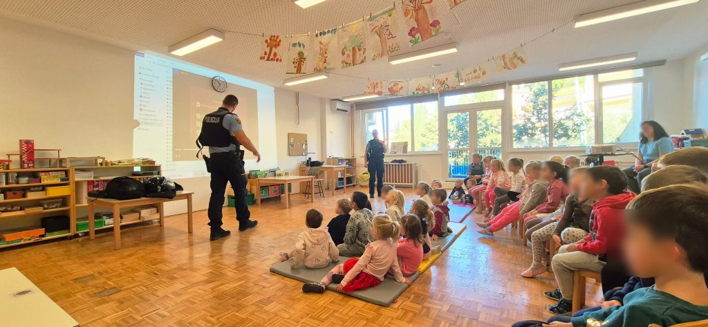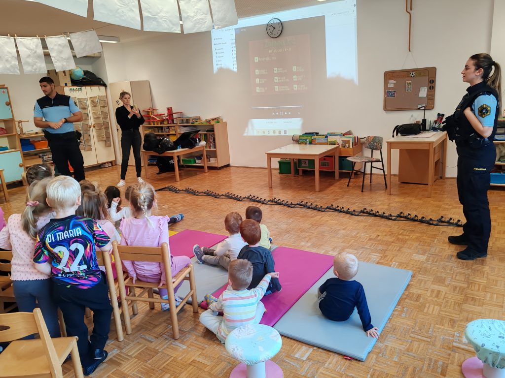 Ob obeležitvi tedna otroka sta nas na novi lokaciji (na OŠ v Piranu) obiskala policistka Mirela in policist Rok. Predvajala sta nam tri kratke animirane filme s poučno vsebino o varnosti v prometu in tem kako lahko pomagamo ljudem v prometu, ko potrebujejo pomoč. Pokazala sta nam tudi opremo, ki jo potrebujejo pri delu in pripovedovala na kakšne načine vse policisti pomagajo ljudem. Izvedeli smo veliko novih pravil, ki jih bomo pridno upoštevali na sprehodih.
