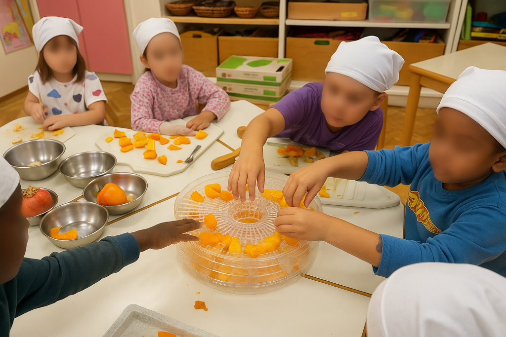 Na našem vrtčevskem igrišču raste posebno drevo – drevo kaki, ki smo ga zasadili pred več desetimi leti z otroki, ki so takrat obiskovali našo enoto Ježek. Drevesu še danes, kot takrat radi zapojemo, se pod njegovo krošnjo igramo, posedamo, mu pripovedujemo svoje skrivnosti ali opazujemo živali, ki ga obiskujejo. V zameno, nas vsako jesen drevo privabi s svojimi žareče oranžnimi plodovi. Skupaj se Škratki zberemo pod drevesom, raztegnemo zaboje in košarice ter previdno poberemo mehke plodove, na kar sledi najlepši del – kakije jemo, jih sušimo, včasih pa tudi marmelado naredimo.